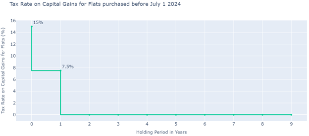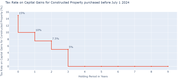 Source: Finance Bill 2024 a The Finance Act 2024 dispenses with the holding period concept altogether. Instead, any property that is sold off, regardless of the period it is held for, will now have its capital gains taxed at a flat 15% for tax filers. For non-filers, the tax rates will be even higher. The taxable income from property sales will be treated as income and taxed according to the relevant income tax bracket but, as the Finance Act 2024 clearly stipulates, will not be less than 15% of the income and can reach up to 45%. This is applicable to all properties acquired on and after July 1, 2024.  For properties acquired before July 1, 2024, the previous tax rates mentioned above will still be applicable.